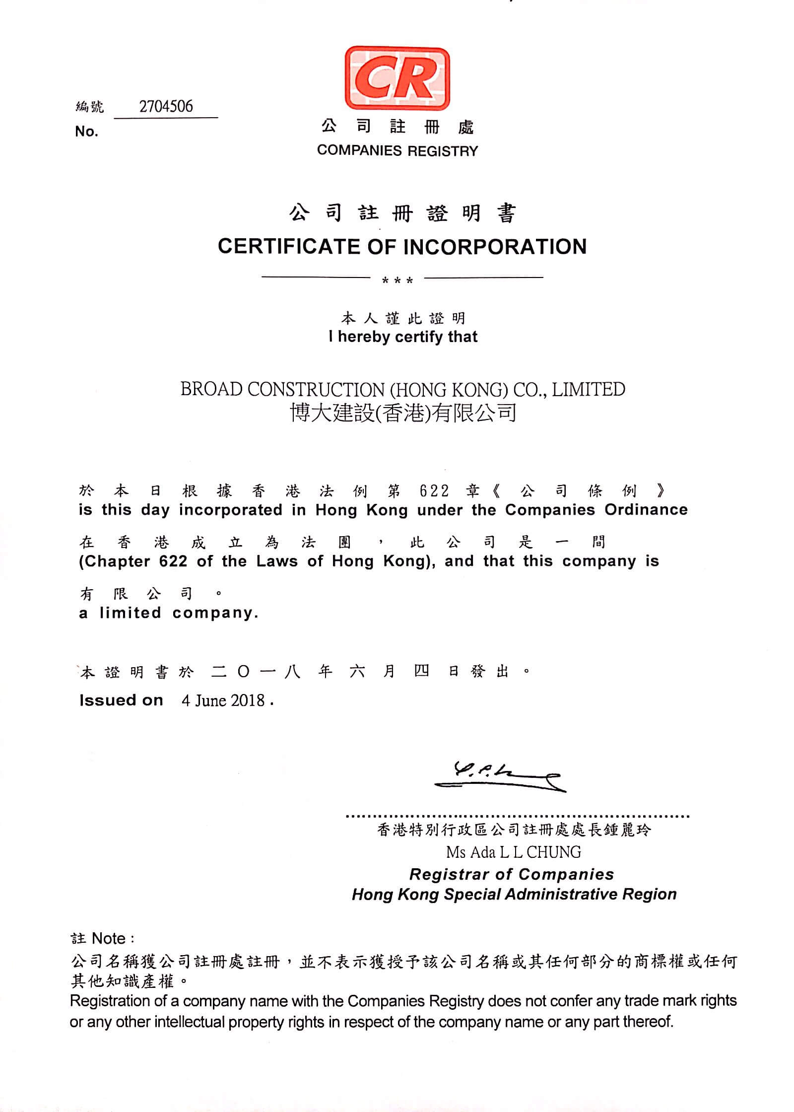6月4日,博大建設(shè)集團(tuán)香港公司正式注冊(cè)成立,博大建設(shè)集團(tuán)總部設(shè)在深圳,加上之前成立的澳門(mén)公司,初步完成粵港澳大灣區(qū)的戰(zhàn)略布局。