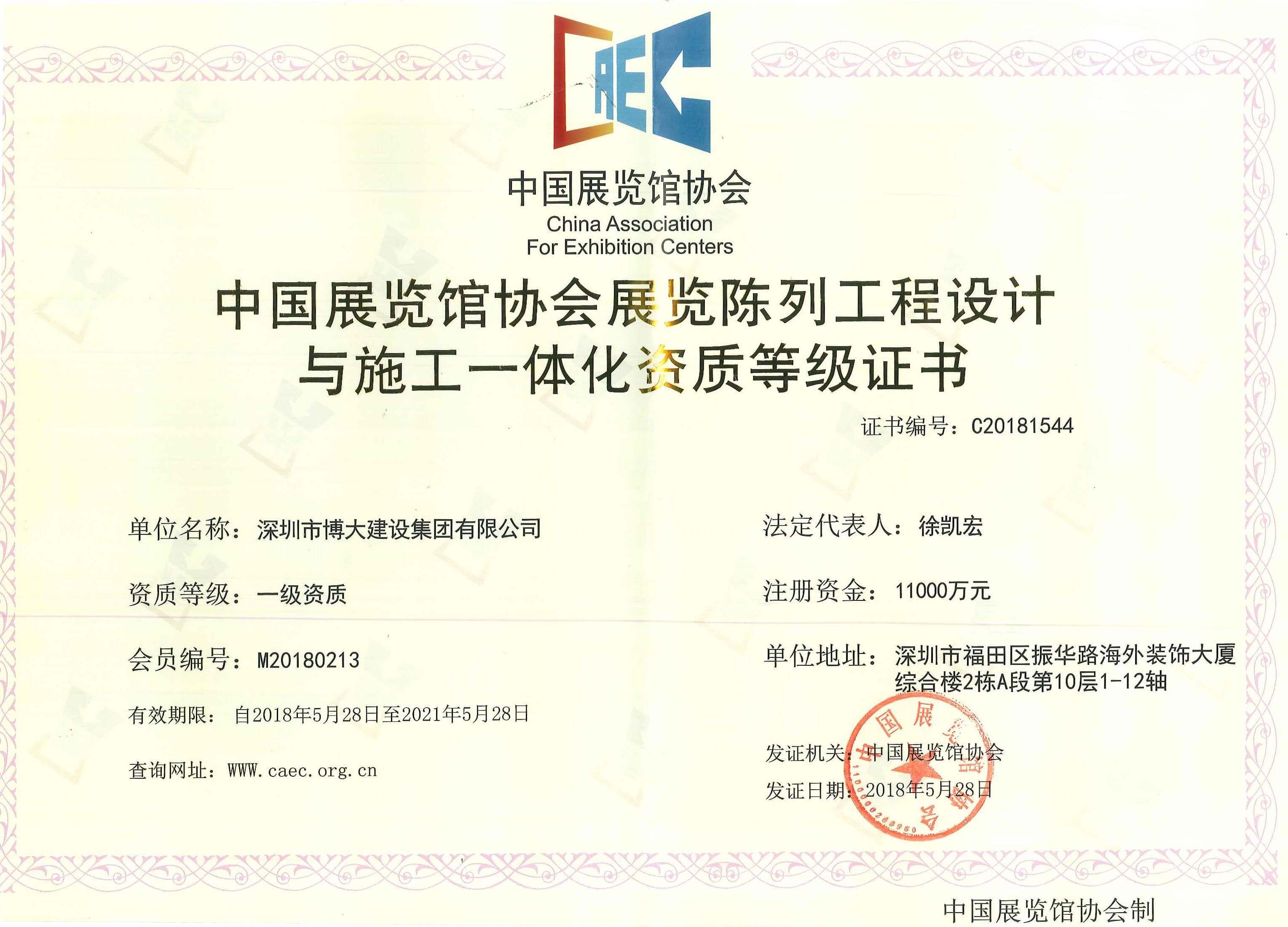 博大建設(shè)集團(tuán)作為行業(yè)最具發(fā)展活力的企業(yè),近年來以迅猛的成長速度,得到了越來越多的關(guān)注和認(rèn)可。在各級(jí)領(lǐng)導(dǎo)的關(guān)懷和全體家人的共同努力下,集團(tuán)資質(zhì)建設(shè)取得新的進(jìn)展:獲得展覽工程企業(yè)一級(jí)資質(zhì),展覽陳列工程設(shè)計(jì)與施工一體化一級(jí)資質(zhì)。
