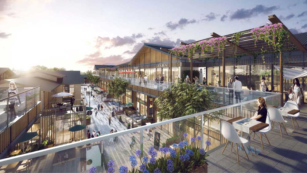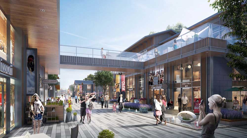 商業(yè)街外立面選用仿木型材及鋁板,屋頂采用琉璃瓦,將仿古建筑的歷史韻味和科技感、時(shí)尚感融為一體。