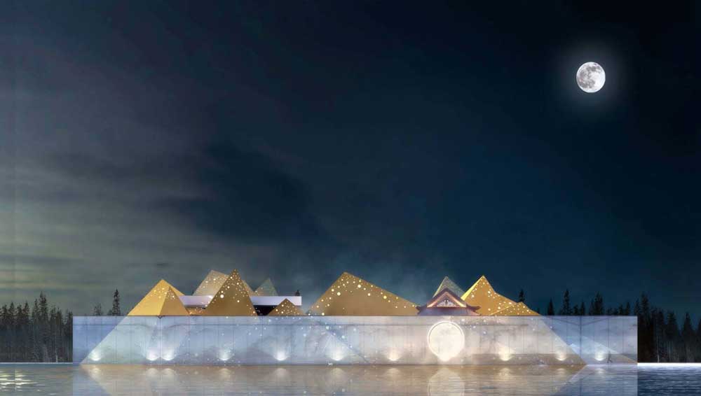 圖7為藝術(shù)展覽館。以月影為主題,形似金字塔,外墻采用古銅色鋁板密拼做法,四周外墻采用傳統(tǒng)的框架式玻璃幕墻。在月光下塔體倒映在玻璃外墻上形成像山脈一樣的山水畫(huà),體現(xiàn)出了設(shè)計(jì)的藝術(shù)色彩。