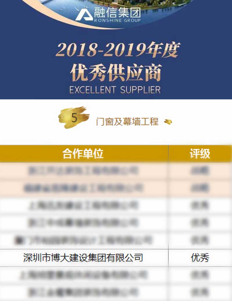 博大建設(shè)集團在2018-2019年度成績突出,榮獲融信集團頒發(fā)的門窗及幕墻工程“優(yōu)秀供應(yīng)商”稱號。融信集團創(chuàng)立于2003年,總部位于上海,是中國房企20強。