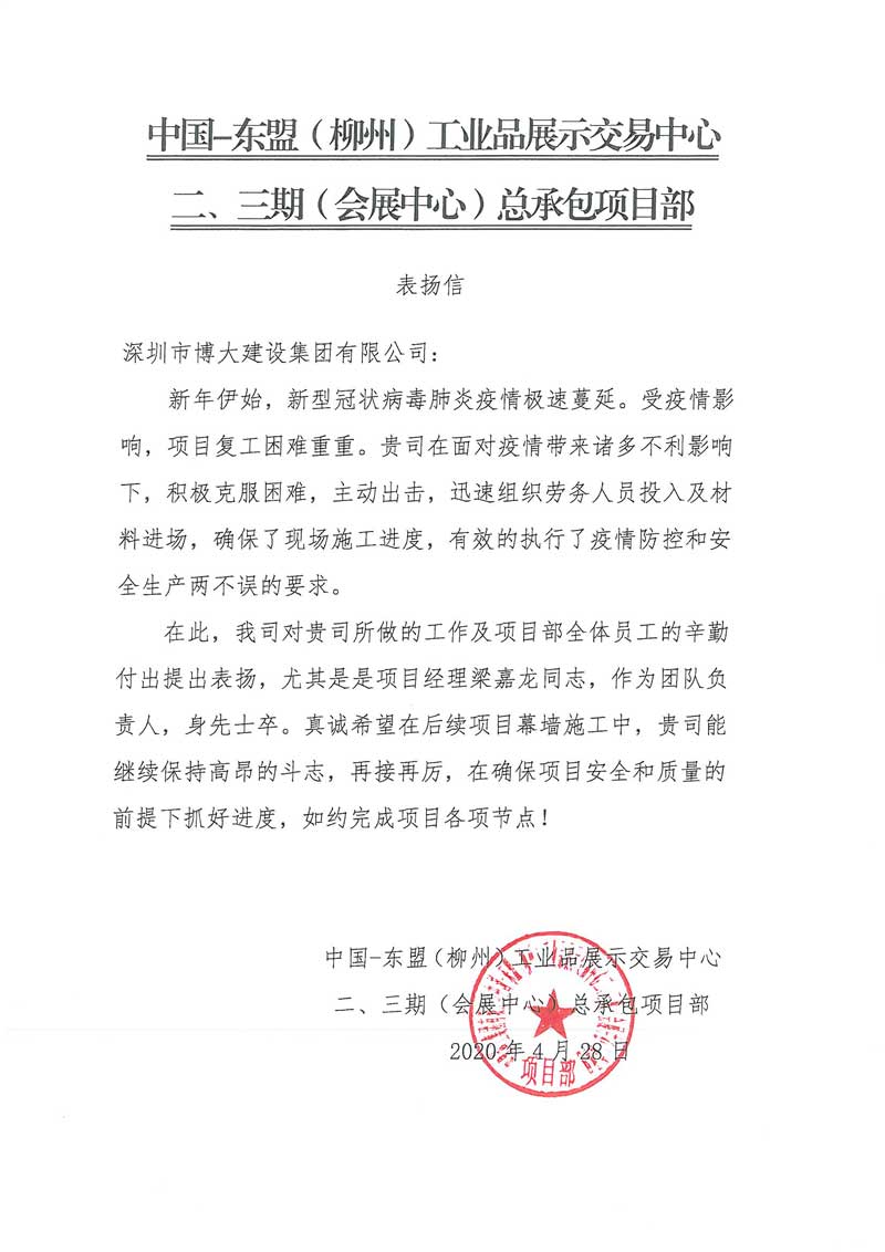 博大建設(shè)集團在中國-東盟(柳州)工業(yè)品展示交易中心二、三期(會展中心)項目中,積極克服疫情造成的困難,主動出擊,確保了現(xiàn)場施工進度,有效的執(zhí)行了疫情防控和安全生產(chǎn)兩不誤的要求,獲得客戶表揚。
