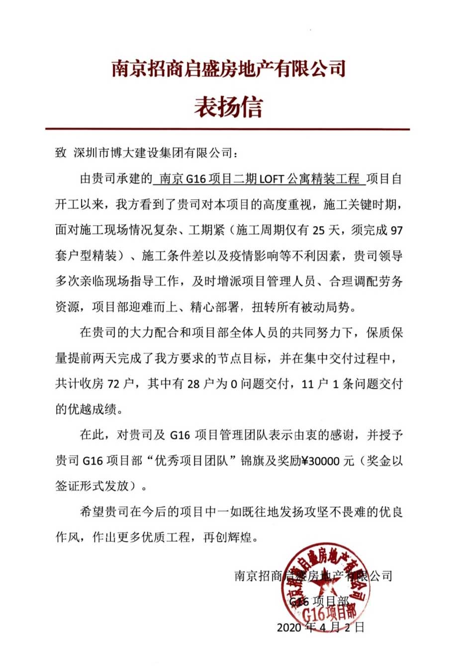 博大建設(shè)集團在南京G16項目二期LOFT公寓精裝工程中,迎難而上,積極解決工期問題,以高標準的質(zhì)量,提前完成節(jié)點目標,受到客戶的表揚,并榮獲“優(yōu)秀項目團隊”榮譽。