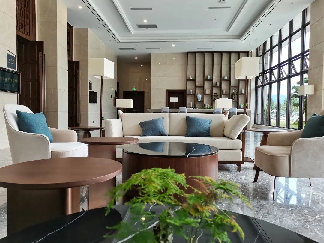 貴州山水特色“小時不識月,呼作白玉盤”,盤州月亮山莊酒店以“月”為主題,處處彰顯“月”的文化元素,“滿月”的石材造型屏風(fēng),用米黃色大理石干掛制作而成,表現(xiàn)“月”的圓滿,溫潤,也需要對石材獨(dú)具匠心的制作工藝。